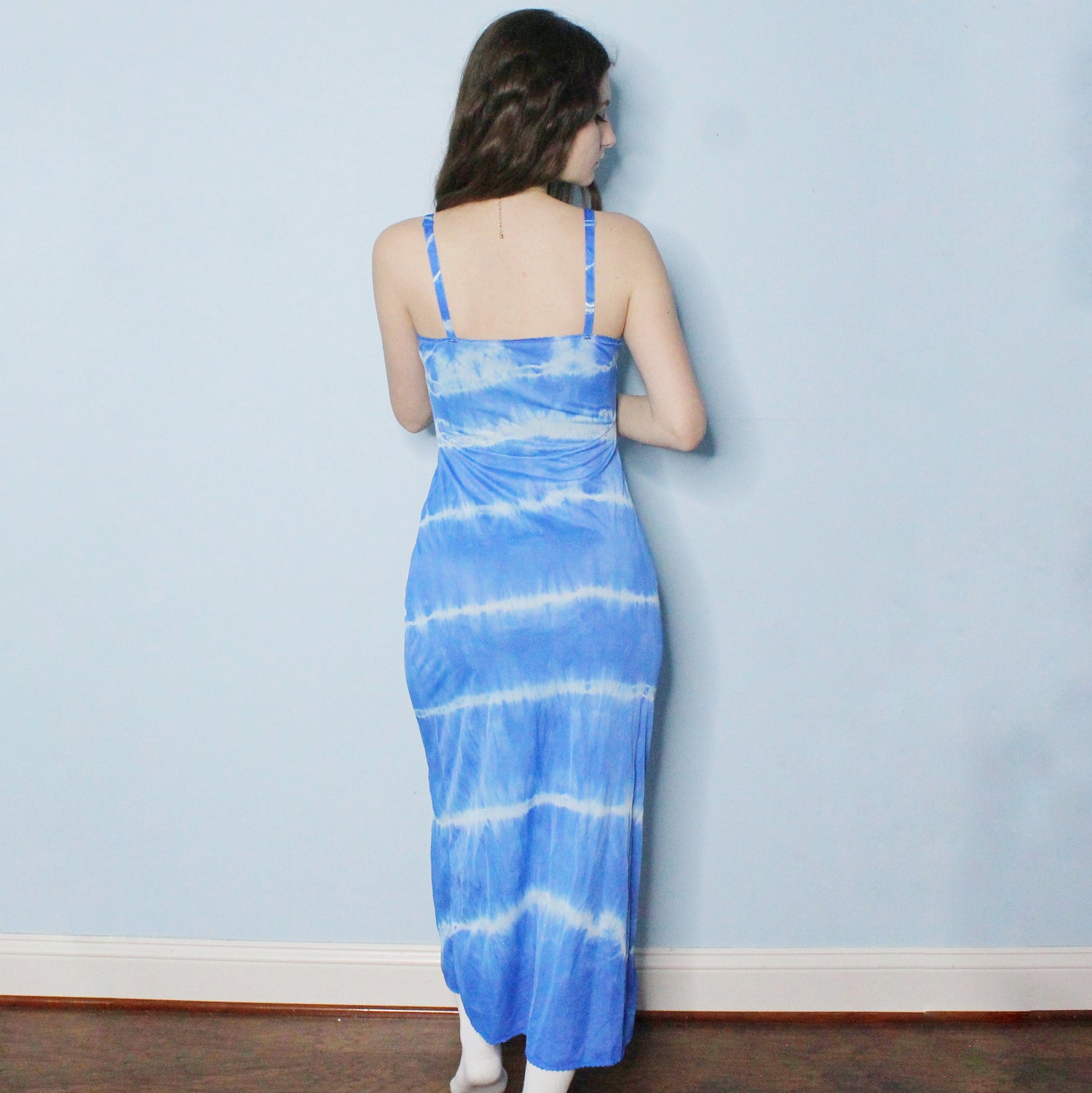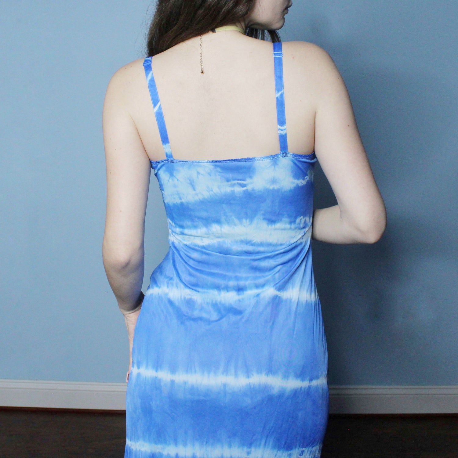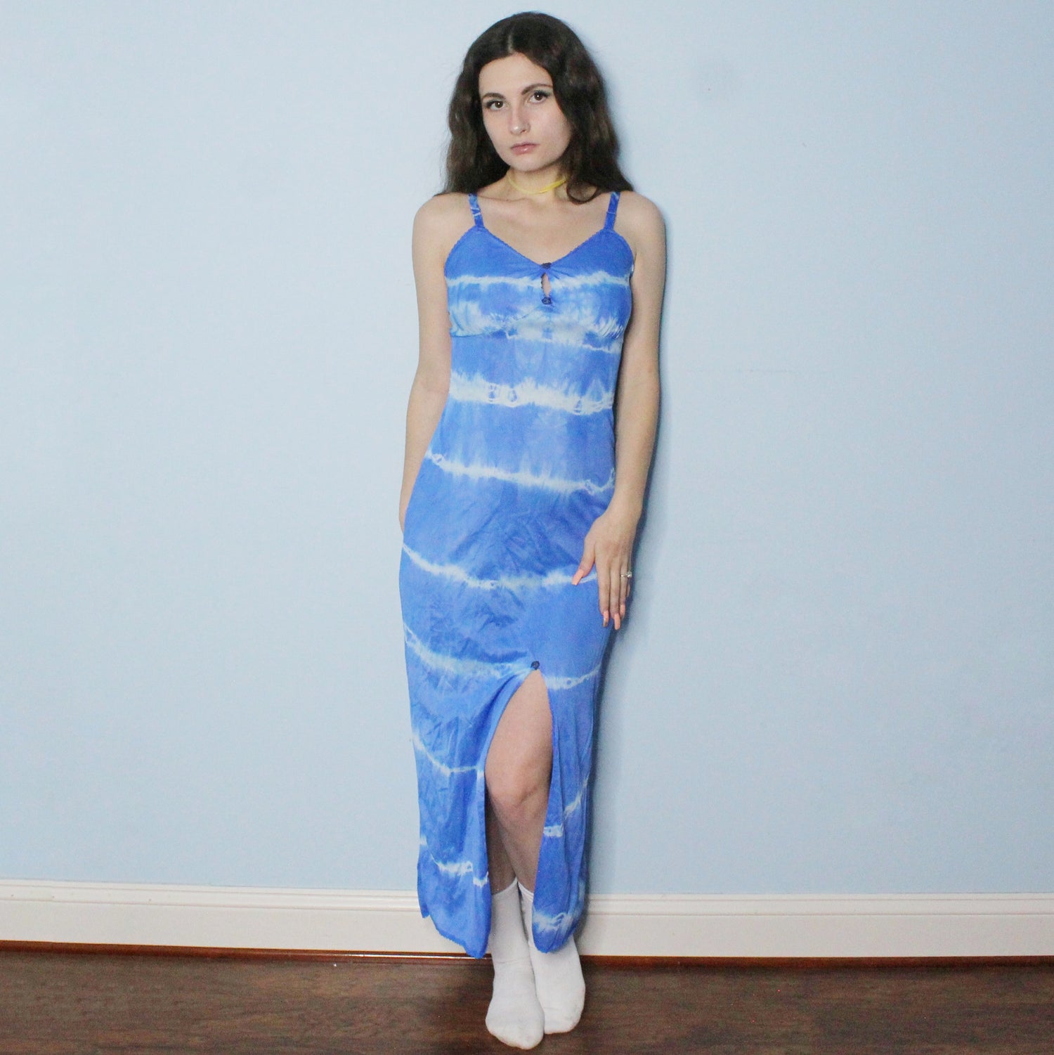 Reworked Dyed Vintage 80's Nightgown by Camelot Apparel Inc.! Maxi Length blue dress with split slit up the front, lace trim, keyhole bust, and dark floral details. Size 34 with some stretch and adjustable straps!!