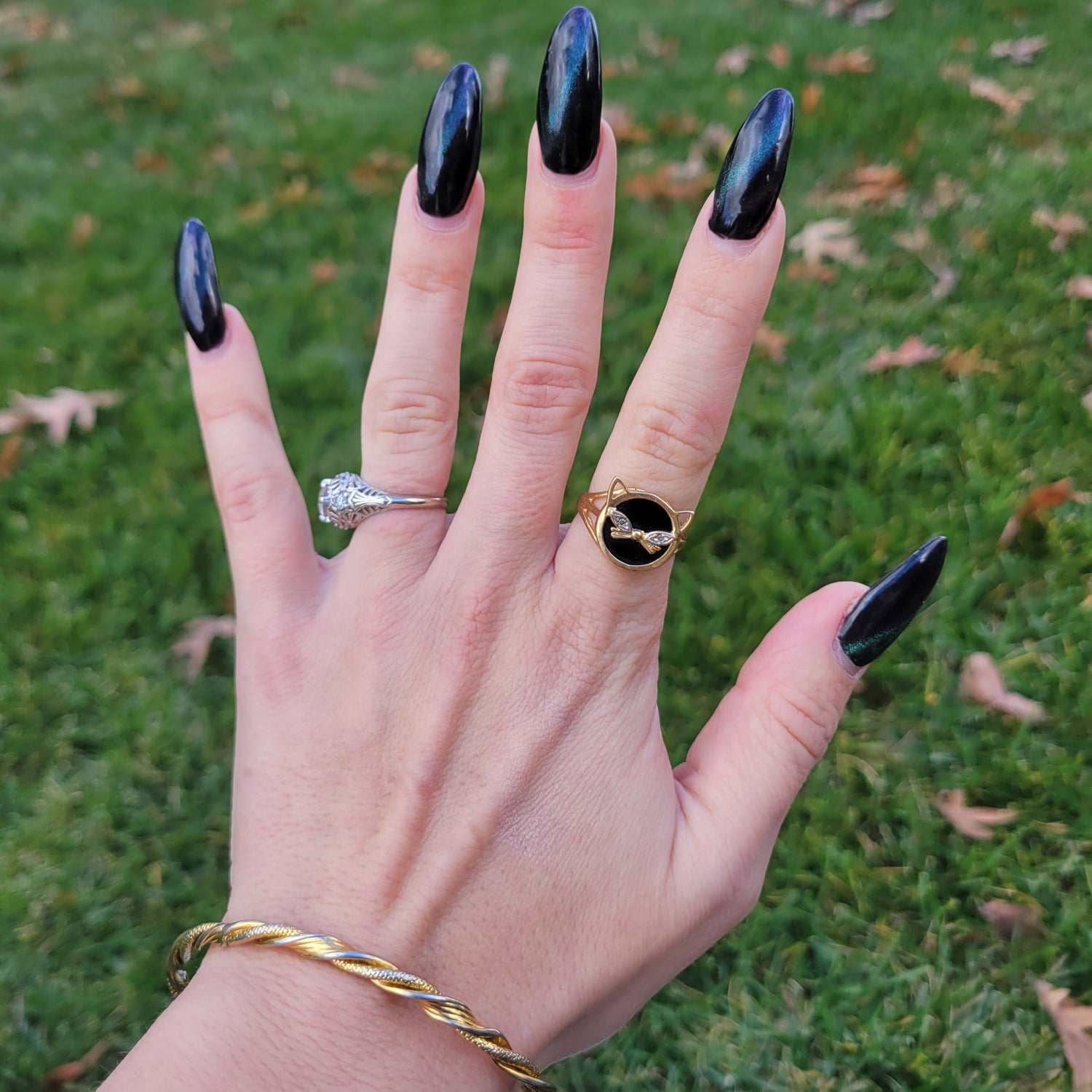 Vintage 80s Black Onyx 14k Gold Cat Ring with Diamond Eyes signed SB
