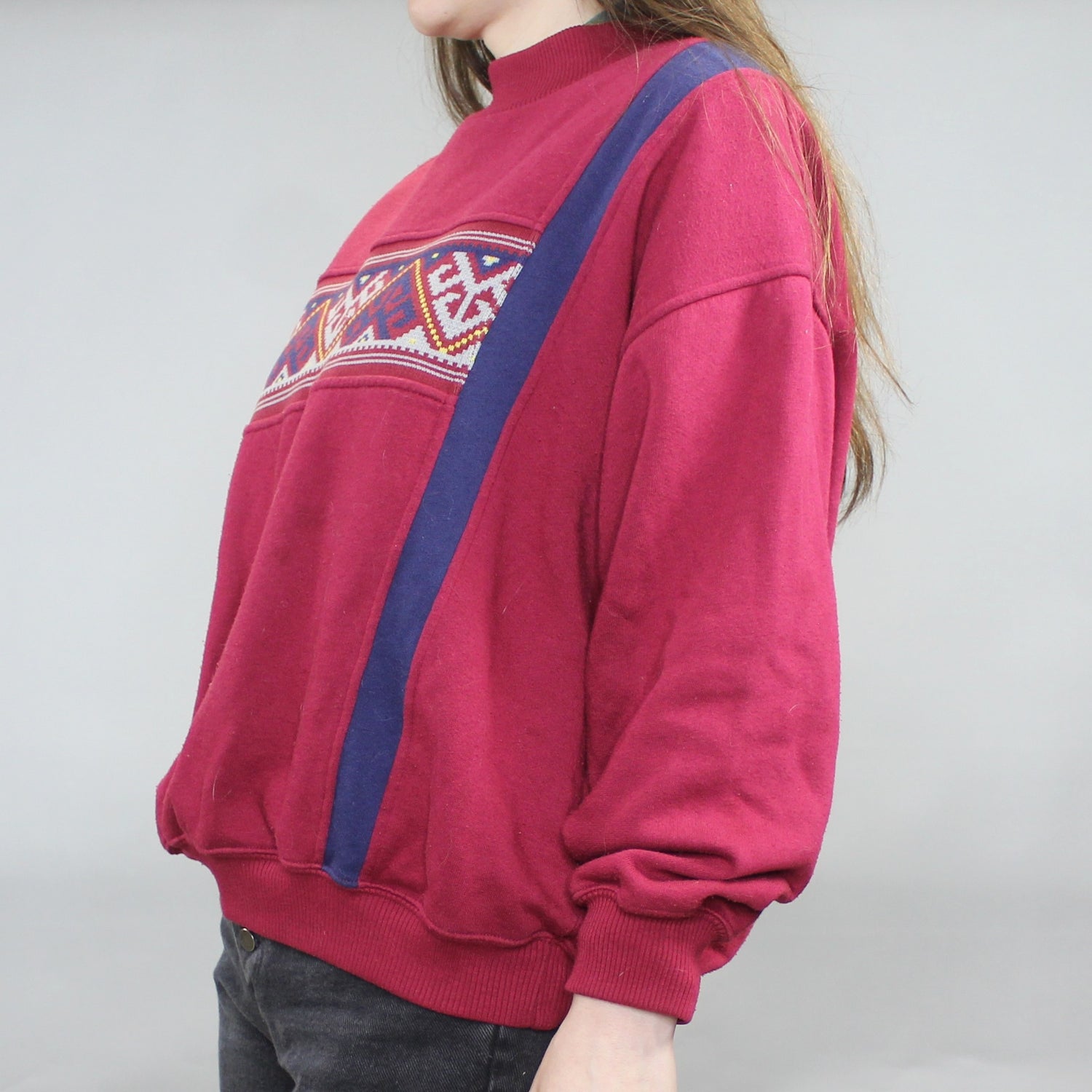 Vintage 80s Funky Sweatshirt by American Sportif! Burgundy mock neck pullover sweatshirt with patterned bust, and navy accents. Marked a PL