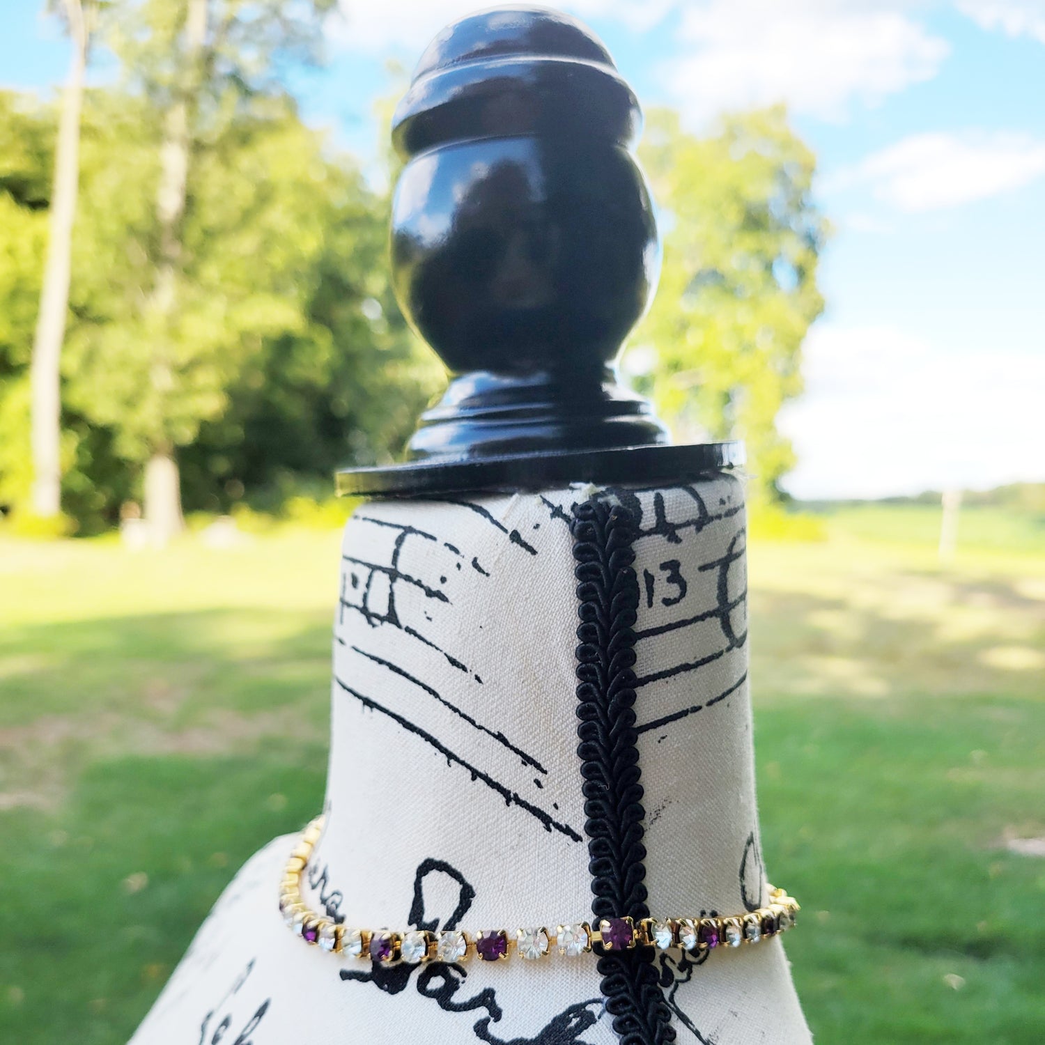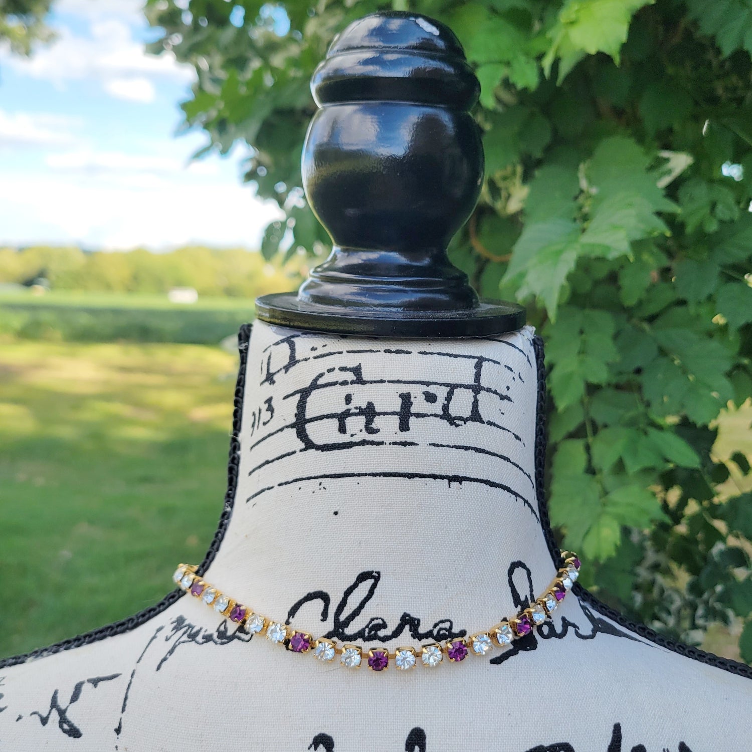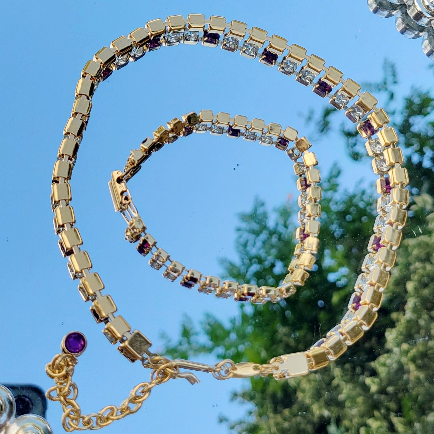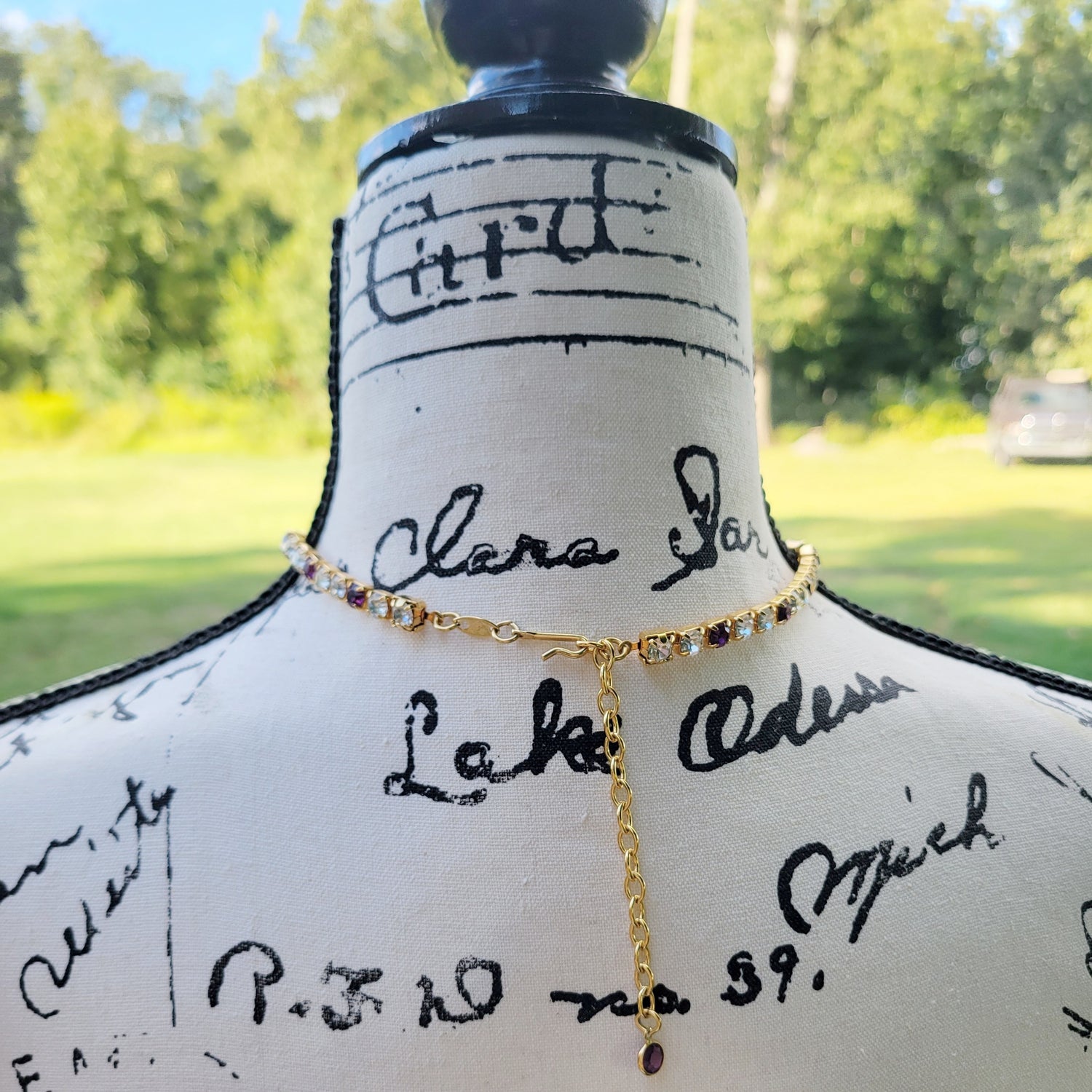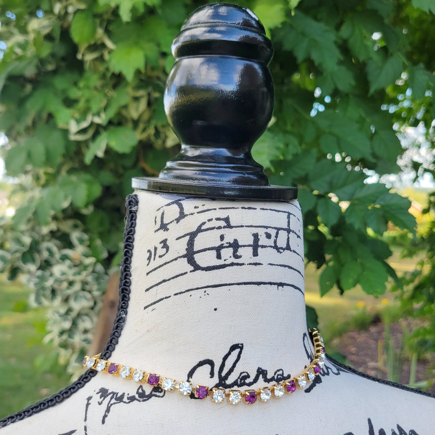 Vintage 90s Signed Trifari Jewelry Set! Matching tennis bracelet and choker with alternating purple and colorless crystals. Choker is adjustable length.