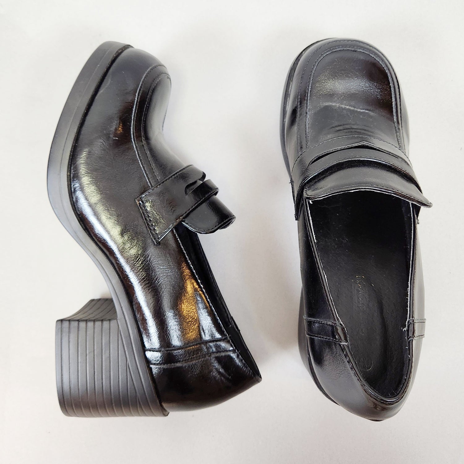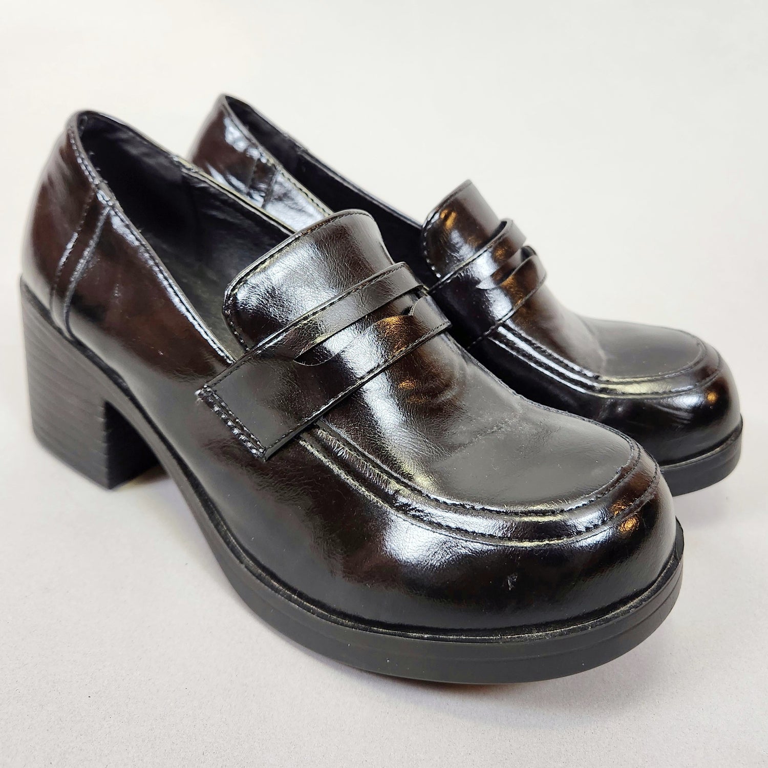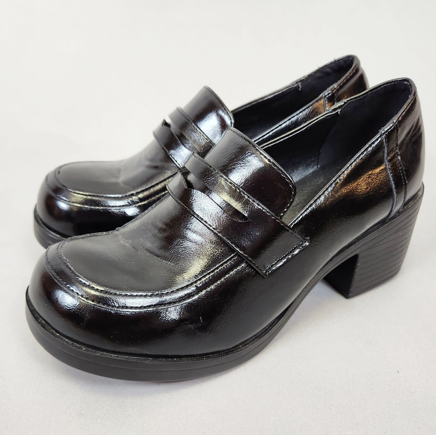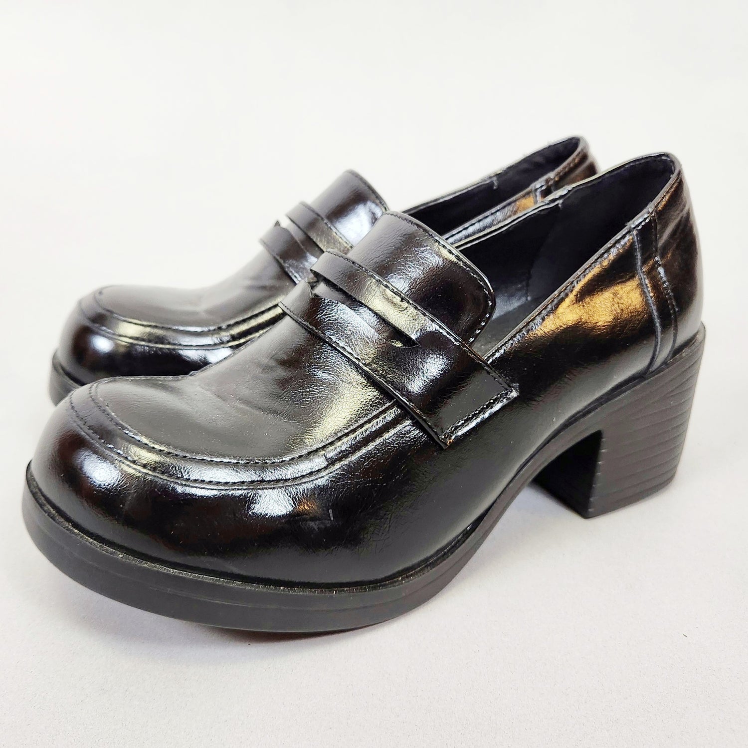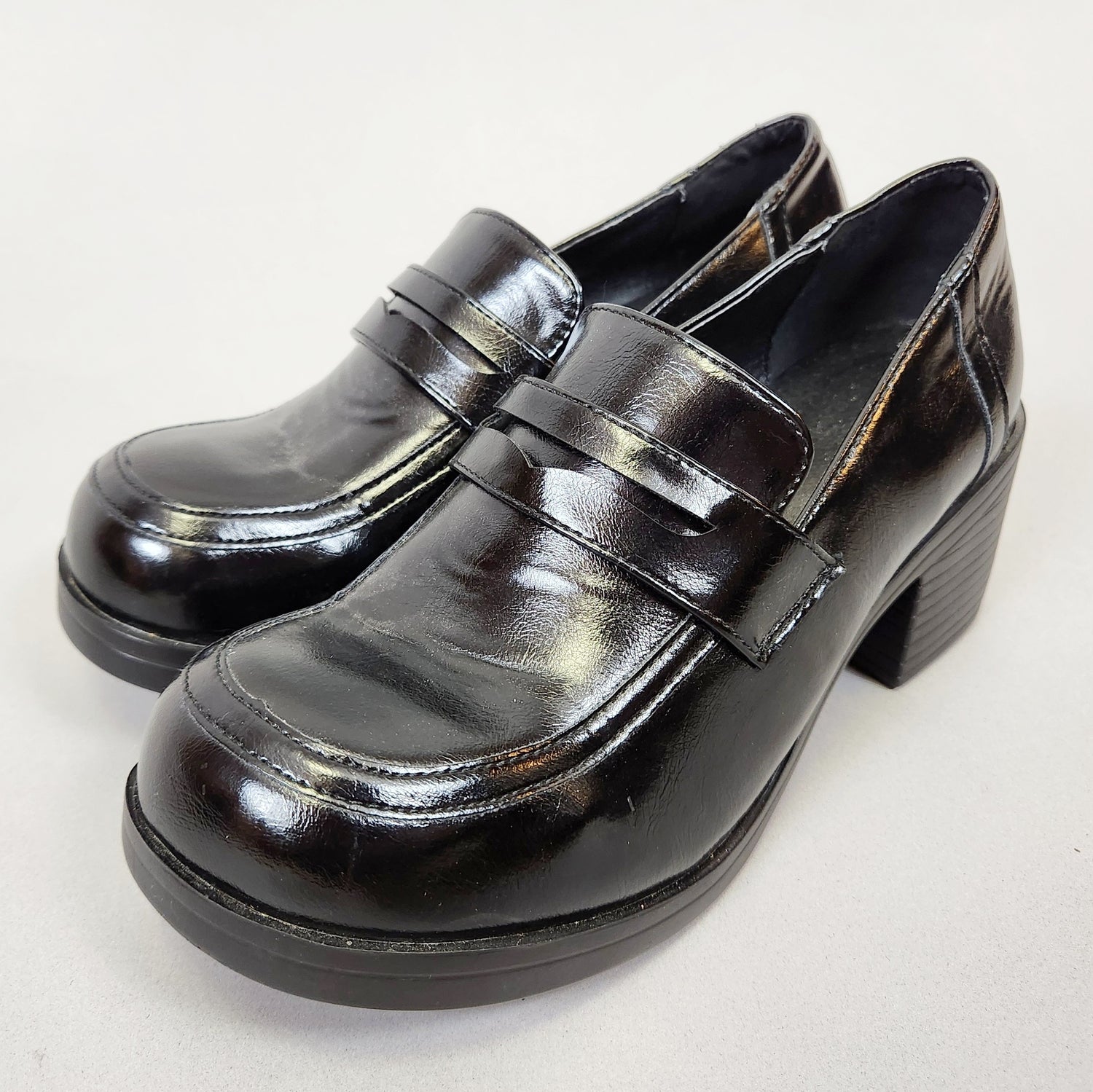 Vintage Y2k Chunky Heeled Loafers! So Britney Spears/schoolgirl coded. Black shiny slip on shoes by the brand Give Show, the only mark I see is a 40 which would translate to a 9.5 BUT these measure about a US Ladies size 7 so please refer to measurements!